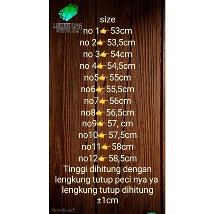 Produk ini memiliki 12 Variasi Ukuran yaitu : 3 Lk 54cm,4 Lk 54,5cm,5 Lk 55cm,6 Lk 55,5cm,7 Lk 56cm,8 Lk 56,5cm,9 Lk 57cm,10 Lk 57,5cm,11 Lk 58 cm,12 Lk 58,5cm,1 Lk 53cm,2 Lk 53,5cm,